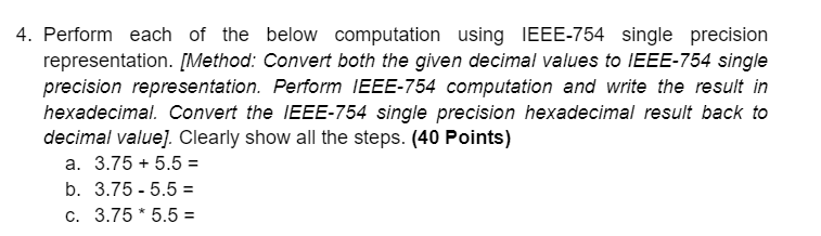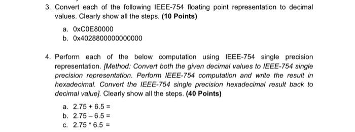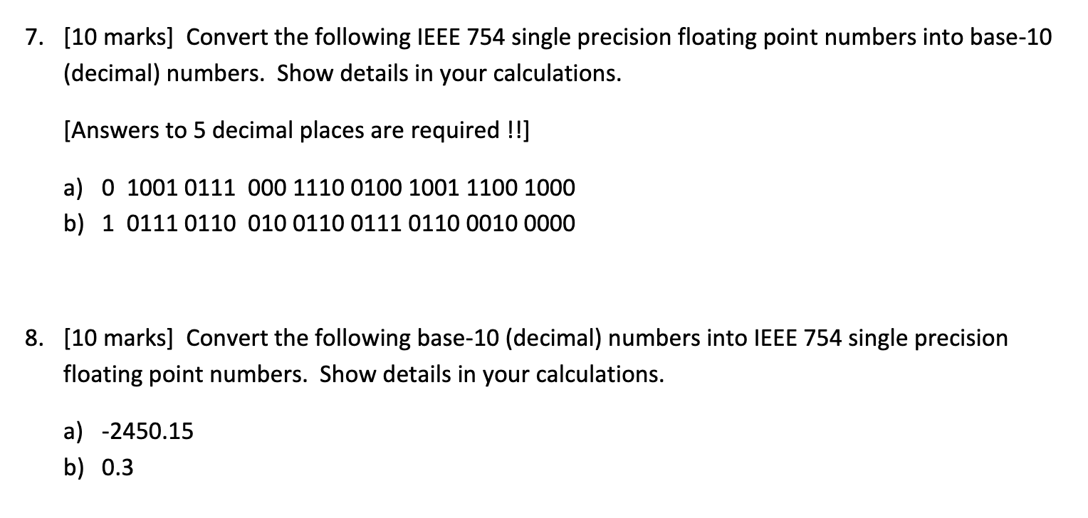 10 marks Convert the following base-10 decimal numbers into IEEE 754 single precision floating point numbers. Convert the following single-precision IEEE 754 number into a floating-point decimal value. The conversion is limited to 32-bit single precision numbers while the IEEE-754-Standard contains formats with increased.